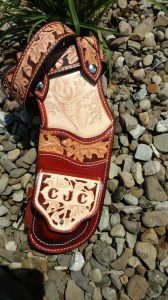 This is a sample of a deluxe tooled Hip Quiver & Belt set. Many custom designs are available for both the quiver and the belt. The quiver is welted to be suitable for both feild points or two blade broadheads. It also includes a molded pocket. A pencil holder, score card clip, and snap strap are also available options.
