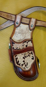 This is a sample of a deluxe tooled Hip Quiver & Belt set. Many custom designs are available for both the quiver and the belt. The quiver is welted to be suitable for both feild points or two blade broadheads. It also includes a molded pocket. A pencil holder, score card clip, and snap strap are also available options.